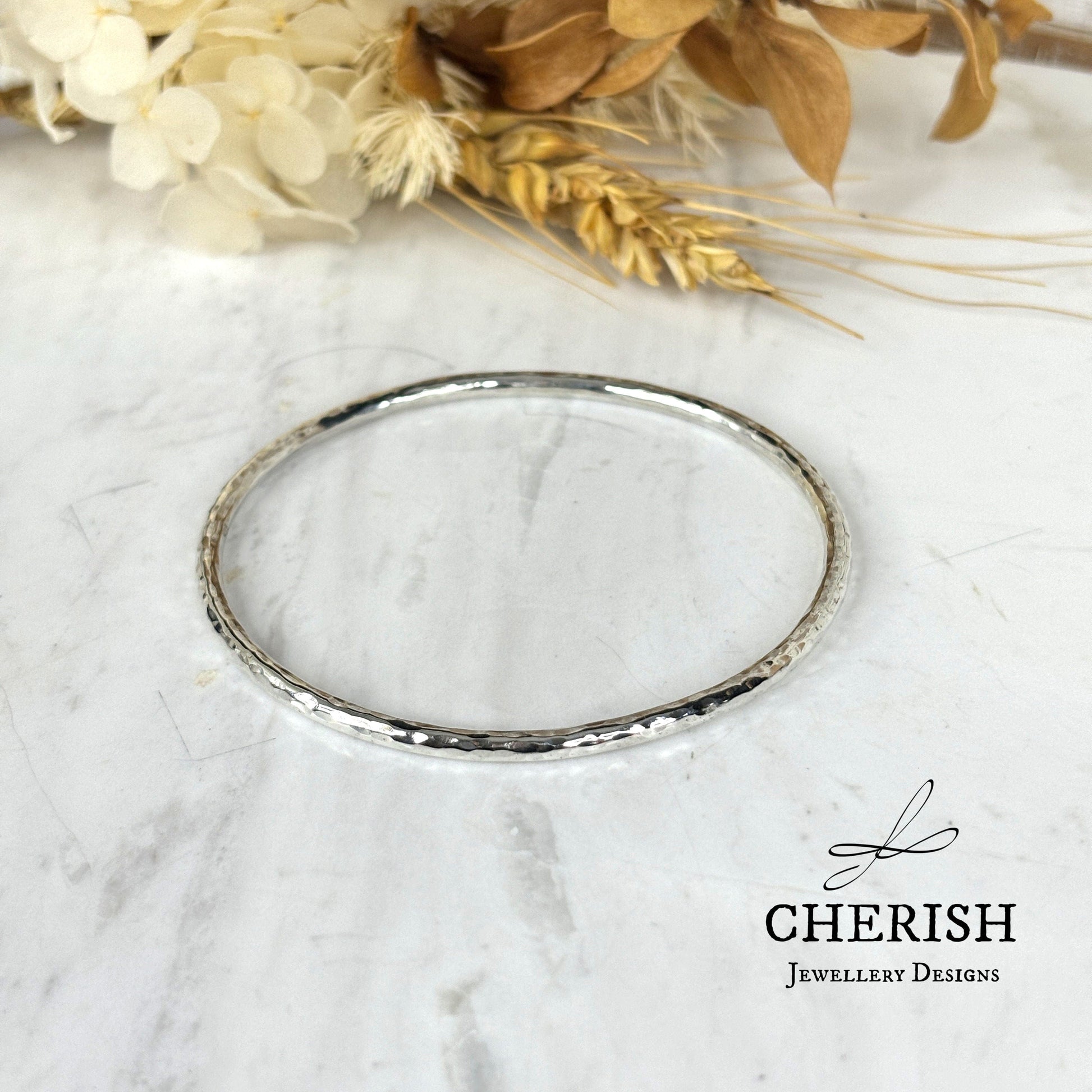 Add some flare to your style with our 4mm Hammered Round Bangles in genuine sterling silver. The hammered texture adds a touch of uniqueness to this simple yet stylish bangle. Perfect for everyday wear!