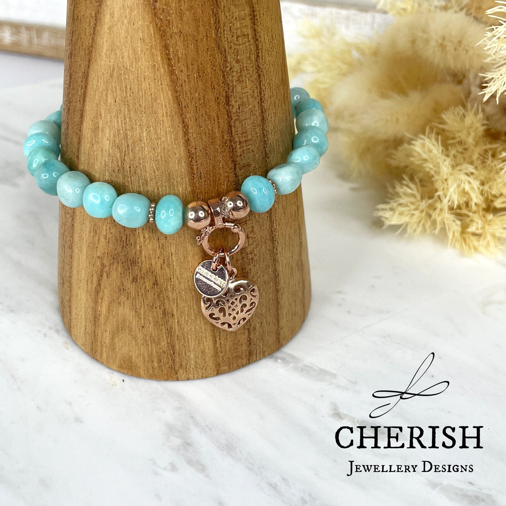 Featuring mini nuggets of polished amazonite, a rose gold mini enhancer, and a sweet filigree love heart charm, this stretch bracelet is sure to turn some heads. Get ready to show off your unique style!