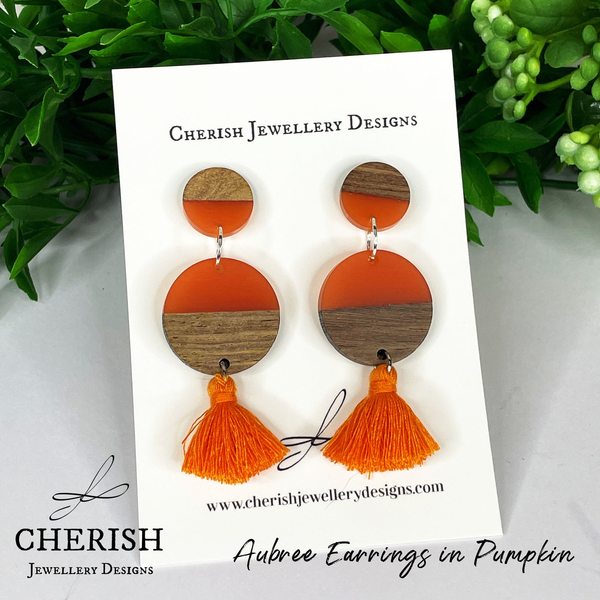 Lightweight resin and timber circles combined with mini cotton tassels to create a fun pair of stud earrings.
