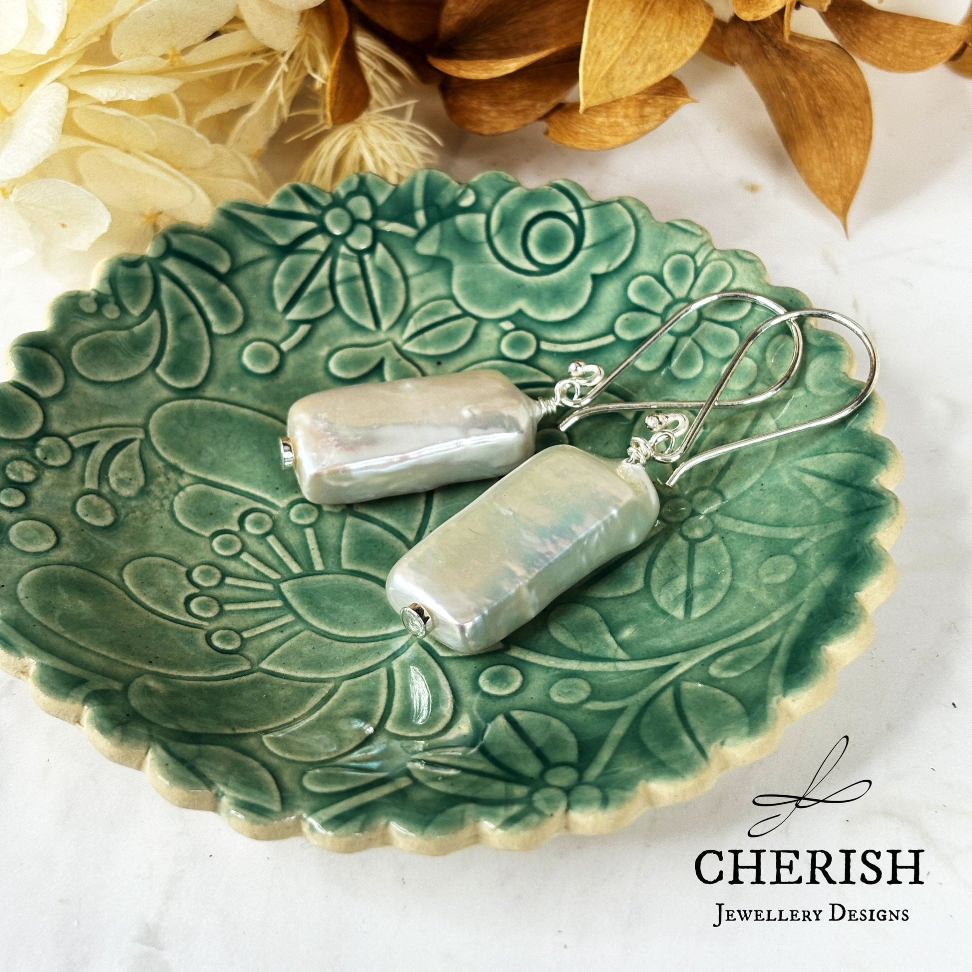These unique and unusual earrings feature rectangular pearls on sterling silver. Perfect for a bridesmaid gift or for someone special.