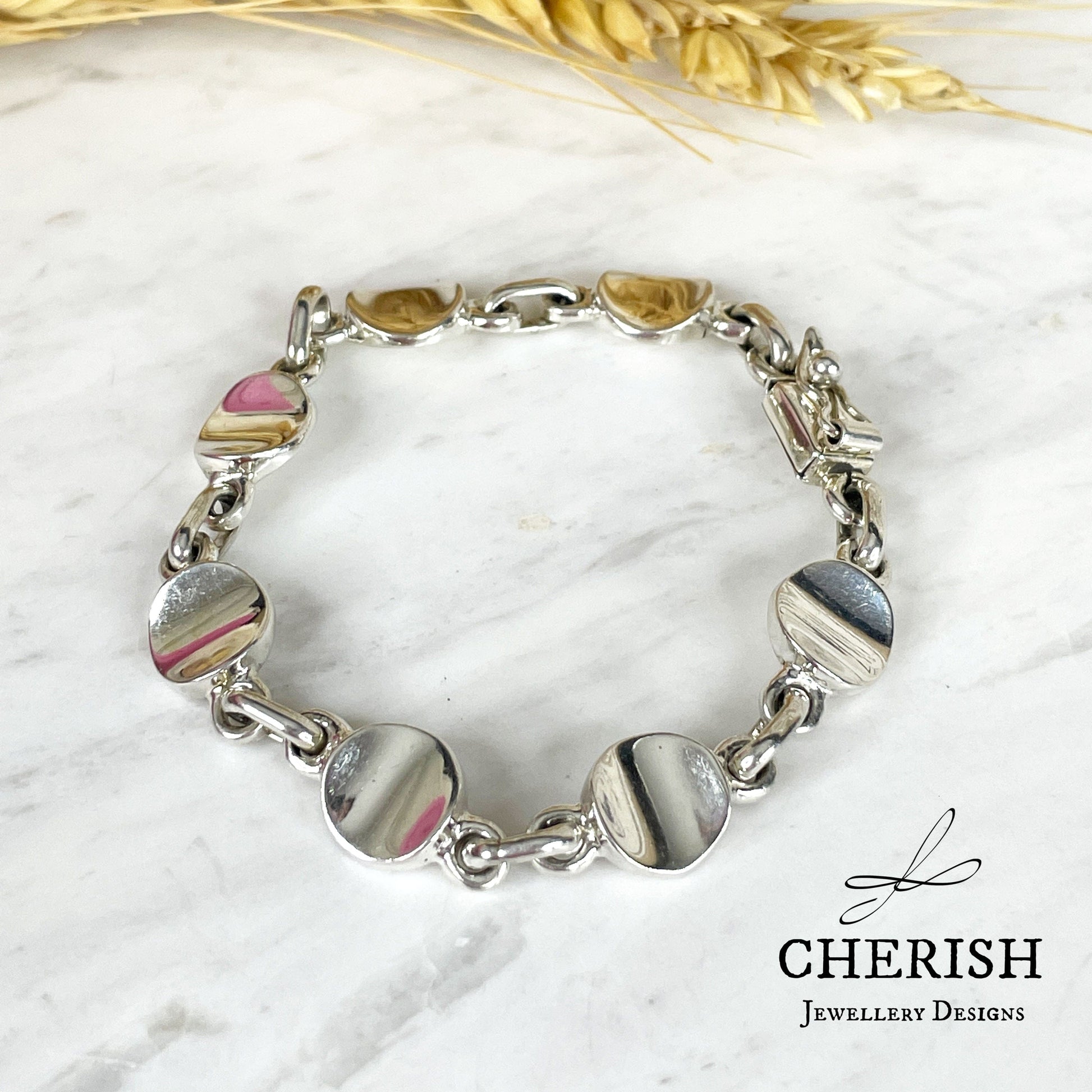 Add some flair to your outfit with this unique sterling silver concave chain bracelet. Its unconventional design is sure to catch the eye, making it the perfect accessory for those who like to stand out.