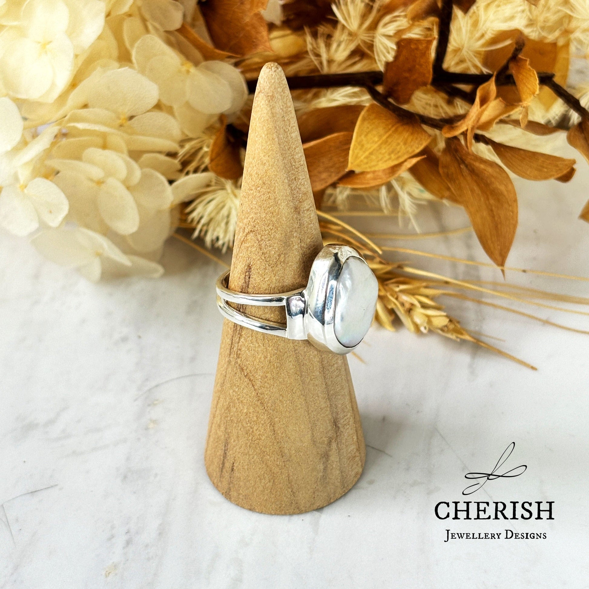Due to the natural state of pearls, each pearl in the ring will be slightly different, some are round and some are teardrop shaped.