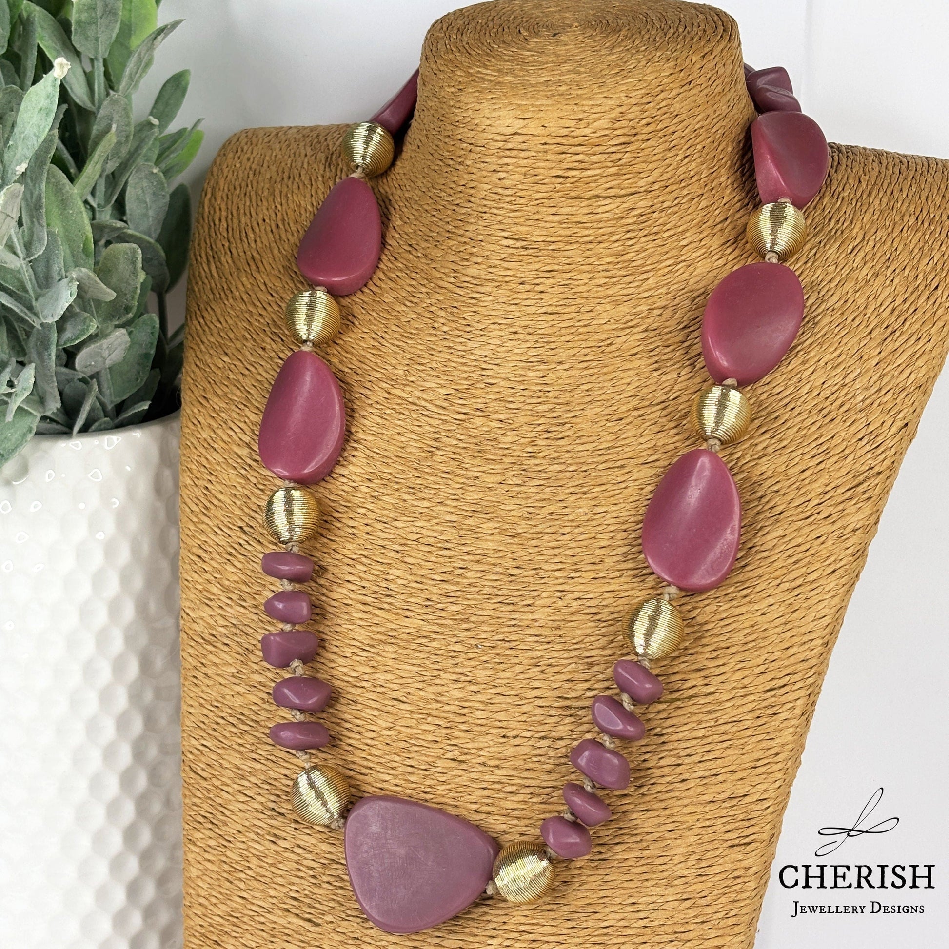 The Daphne Resin Necklace brings a playful Grecian vibe with its matte resin beads hand knotted on cotton cord in three stunning colours: mulberry, sage, and navy.