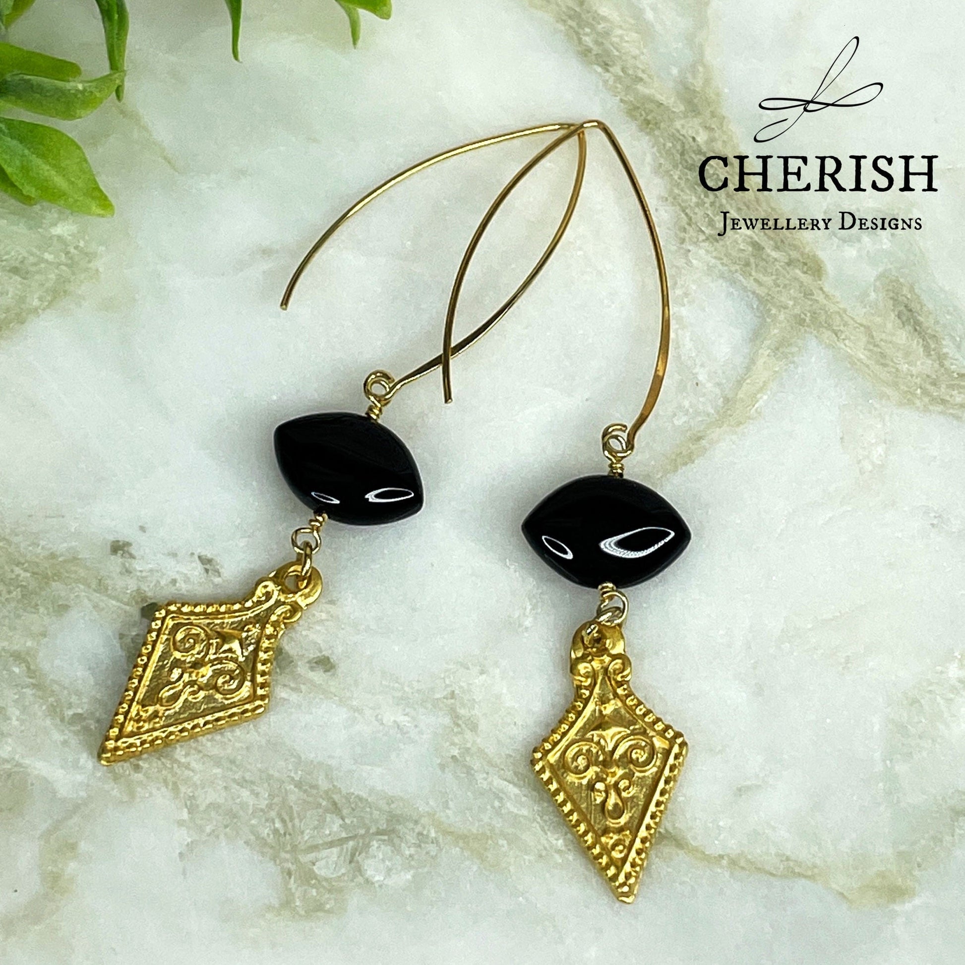 Light weight and comfortable these hand wire wrapped black onyx gemstone beads with intricate gold arrow head charms will make a subtle touch to your outfit. Made using vermeil marquise ear wires, these quality materials will last a lifetime!