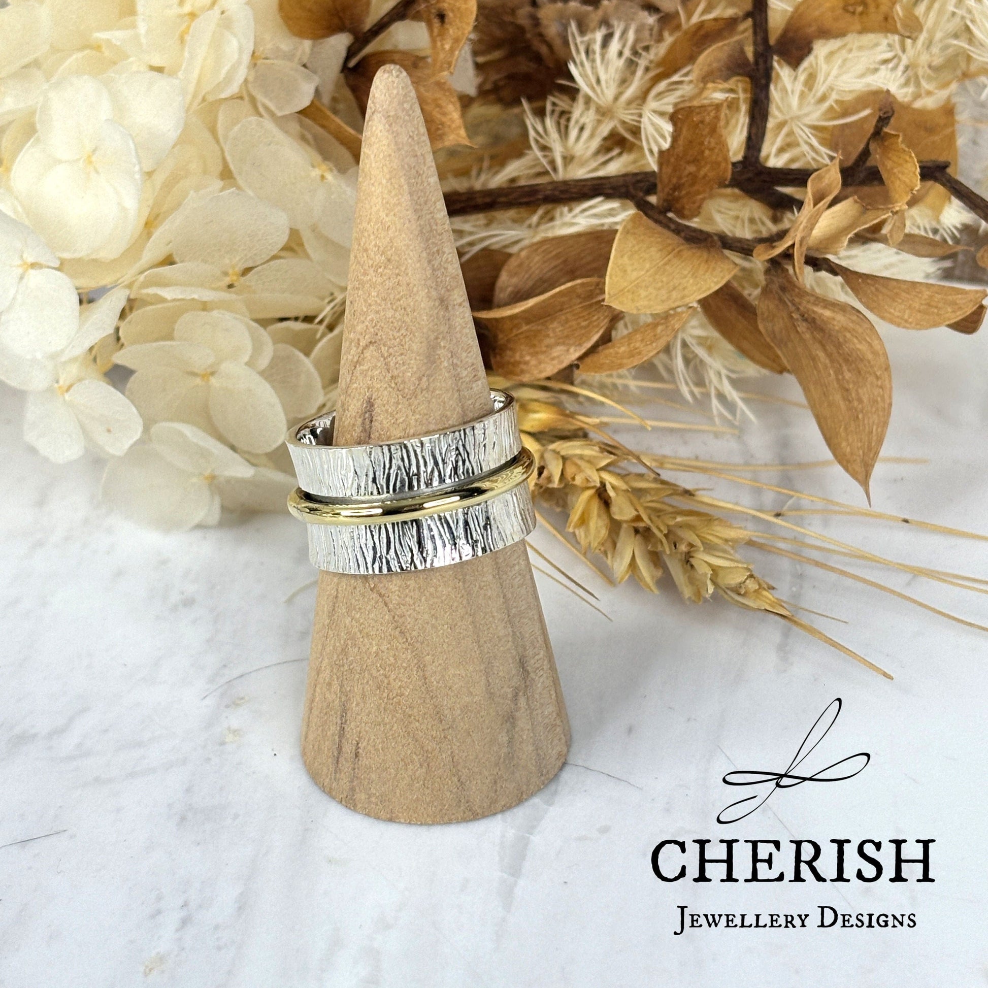 Unleash your good vibes with our Karma Spinner ring! This unique ring features an etched sterling silver wide band and a brass spinner. Keep your positive energy spinning with this playful piece.