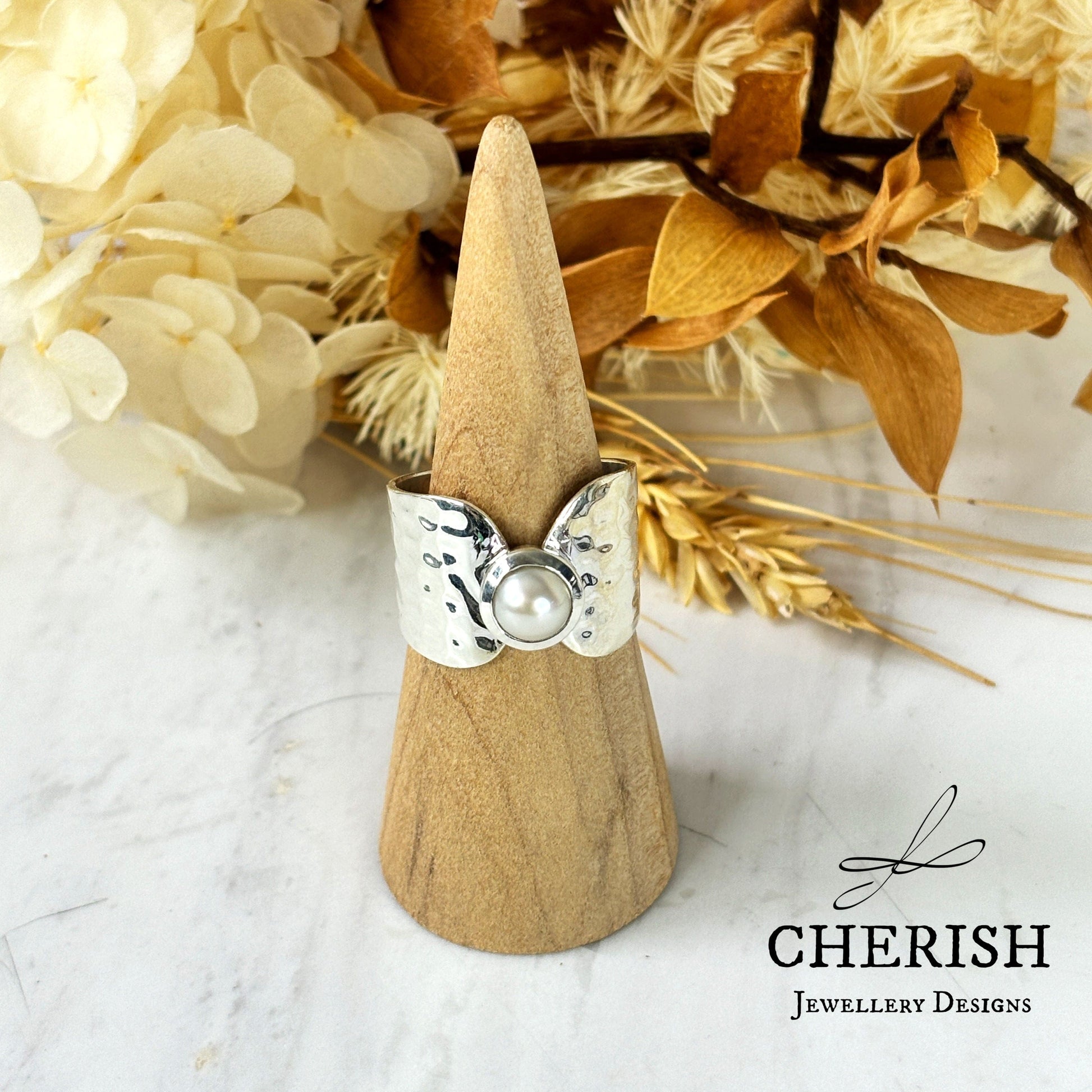 Handmade from sterling silver, the hammered band adds texture and shine to the shiny silver finish. Adorned with an 8mm freshwater pearl, this ring is perfect for adding a touch of elegance to any outfit.